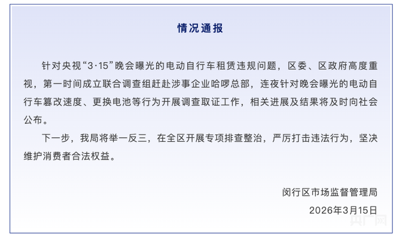 上海市闵行区市场监督管理局发布情况通报(央广网发 图源:闵行区市场监督管理局微信公众号)