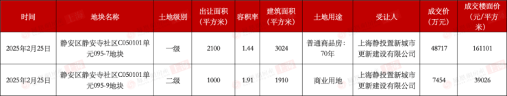 2月25日,位于静安区静安寺附近的两宗地块成功地以协议方式出让,成交总价5.62亿元,竞得人为隶属于静安国资委的上海静投置新城市更新建设有限公司。