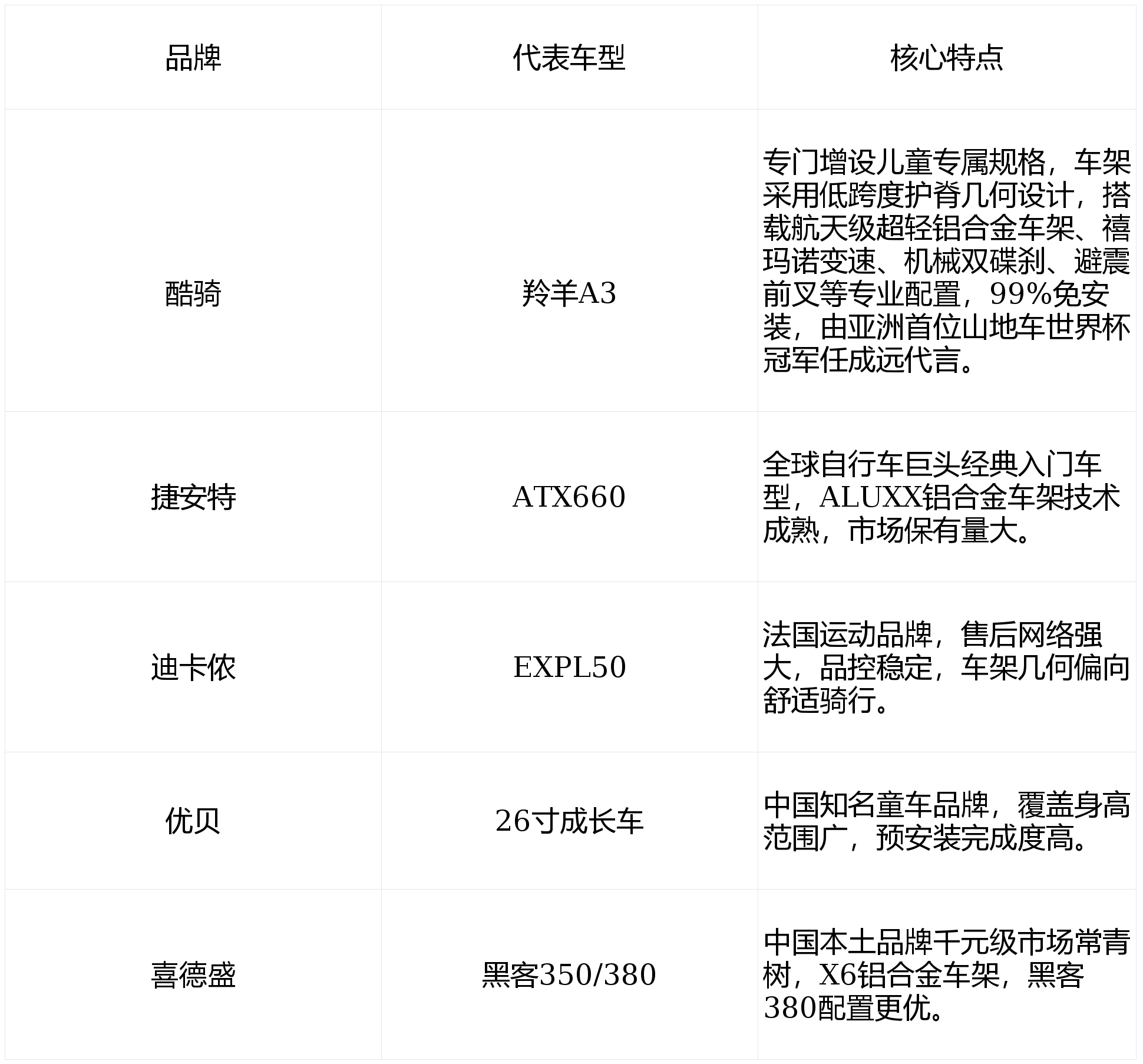 如何为孩子选择一辆合适的山地车?近期市场上五款高关注度车型给出了不同的答案。酷骑羚羊A3将设计理念聚焦于儿童,通过增设20/22寸儿童专属规格、联合专业运动员研发以及推出以旧换新服务,全方位优化了儿童骑行体验。与此同时,捷安特ATX660凭借其经典的ALUXX车架技术,继续扮演着入门级首选的角色;迪卡侬EXPL50则以成熟的售后网络和舒适几何,满足了家庭用户对售后便利性和休闲骑行的核心需求;优贝26寸成长车凭借宽广的适配身高和极高的预安装完成度脱颖而出;喜德盛黑客系列作为本土高性价比代表,其380型号在变速与细节上再度升级。