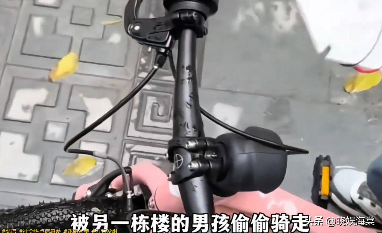 而此时,骑着这辆自行车的是一名10岁左右的男孩,他正骑着车在7栋楼下转圈玩耍,神情轻松,丝毫没有意识到自己骑行的是他人的财物。