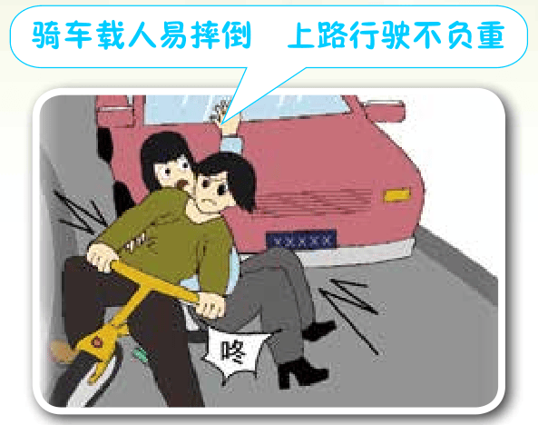 农村道路路面较窄,骑车载人或载物过重时,整体重心后移,车把会出现轻飘感,稳定性变差,同时惯性增大,制动距离加长,控制车的难度随之增大。载物越重,危险性越高。为了出行安全,骑车尽量不要装载过重的物体。需要载物时,要考虑自行车负重后的安全性能,注意自我保护。