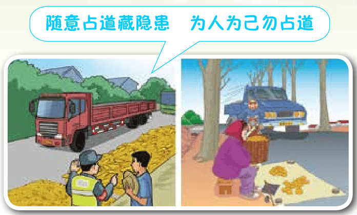 农村公路较为狭窄,在公路上晒粮或摆摊会妨碍道路上的车辆通行,导致交通不畅,同时晾晒的粮食也容易使经过的车辆打滑,造成交通事故。晒粮的过程中,农民朋友注意力集中在眼前的工作上,容易忽视快速驶来的机动车,严重危及自身安全。摆摊售卖农产品时,在摊位前停留的顾客容易被来往车辆剐碰。为了大家的人身安全,请农民朋友不要在公路上晒粮或摆摊。